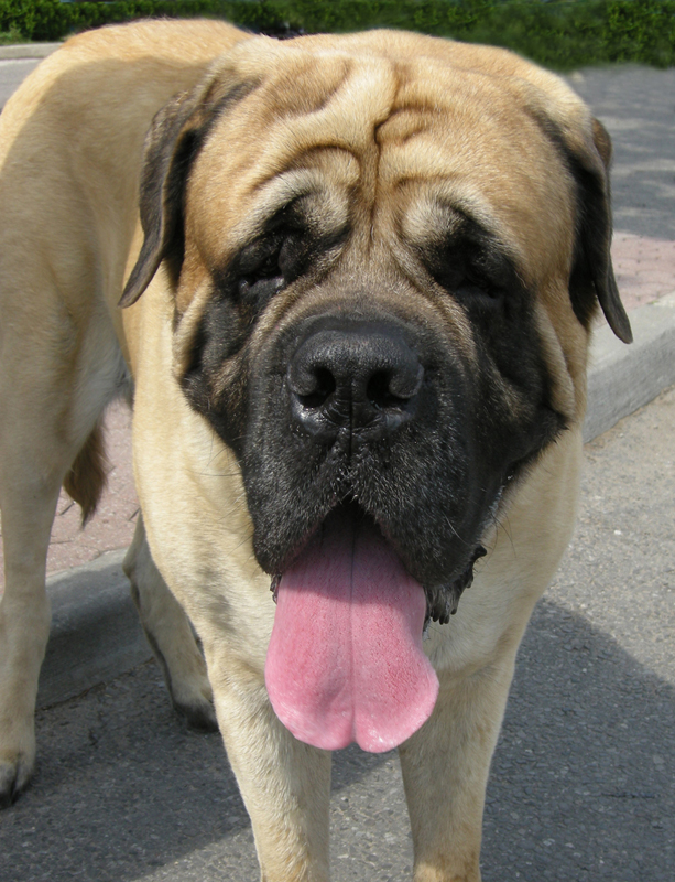 A panting Neapolitan Mastiff dog on a hot day, in direct sunlight on hot pavement.